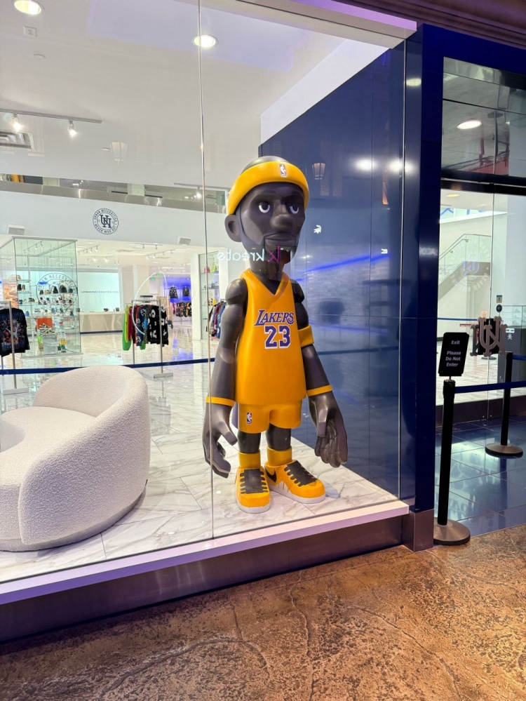 7月16日讯 今天,湖人记者Harrison Faigen晒出了一张商店橱窗里超大的詹姆斯玩偶。
